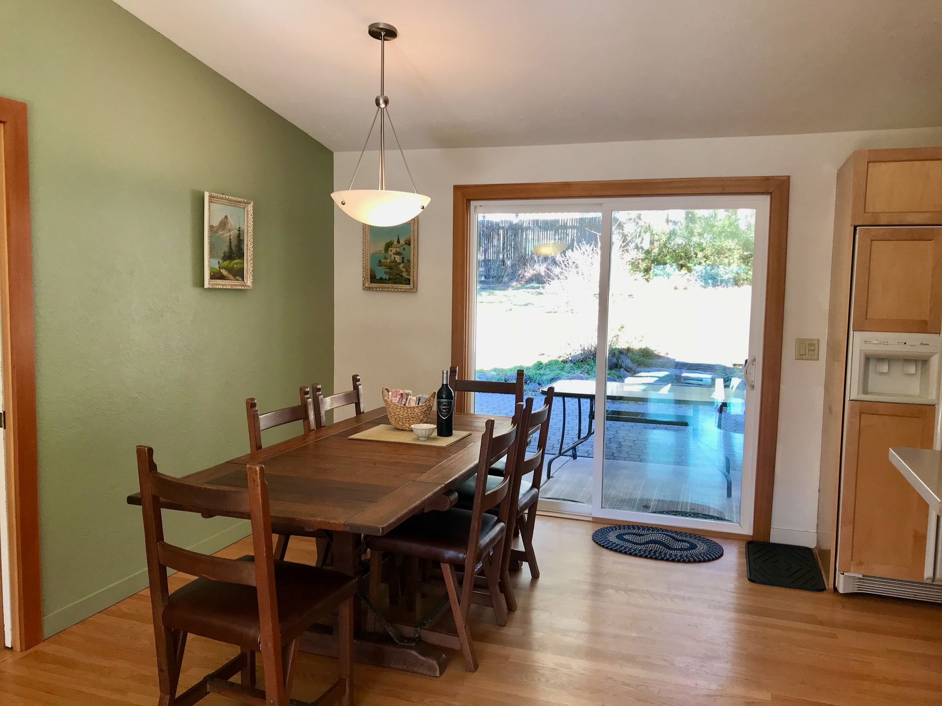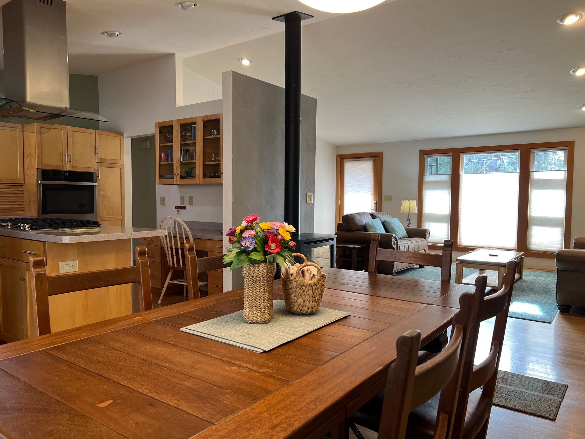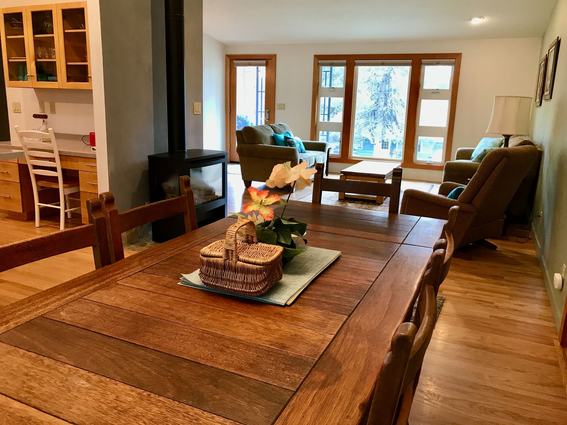 There is a fully-equipped large open area kitchen next to a large dining table and 6 chairs. You'll discover strong wifi, smart TV and a large desk area for remote working vacations, or for creative activities like sewing, scrapbooking, writing, etc. There is an outdoor patio with eating area and a firepit for evening relaxation and conversation in our large fenced backyard.